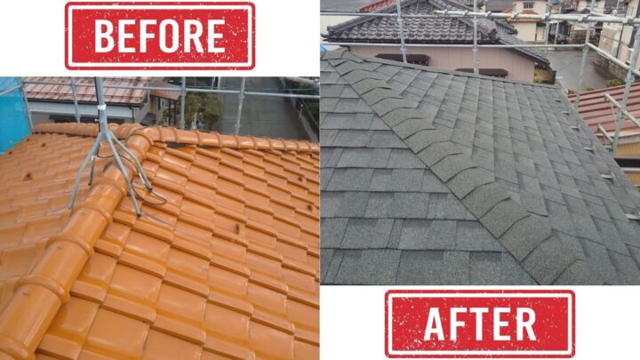 施工前は陶器瓦の屋根で、重量があるため地震時のリスクや経年による劣化が懸念されていました。また、色あせも進み、外観全体に古さが感じられる状態でした。今回の工事では軽量で耐久性に優れたシングル材へ葺き替えを行い、屋根全体がすっきりとしたモダンな印象に変化。落ち着いたグレー調の仕上がりは周囲の景観にも調和し、見た目の美しさだけでなく耐震性や防水性も大幅に向上しました。これにより、長く安心して暮らせる住まいへと生まれ変わりました。