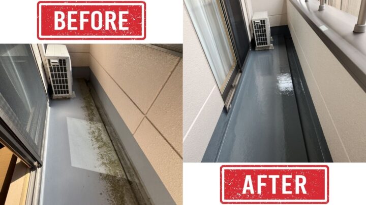 ベランダ床は、汚れや苔の付着、防水層の劣化が進みやすい場所です。BEFOREでは、表面の汚れや防水性能の低下が確認できました。AFTERでは、防水塗装を施し、均一でツヤのある床面に仕上げています。排水性も考慮した施工により、水たまりができにくくなり、日常の清掃もしやすくなりました。見た目の改善だけでなく、雨漏り防止の面でも安心できる仕上がりです。
