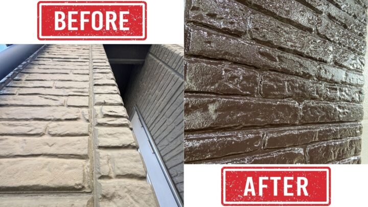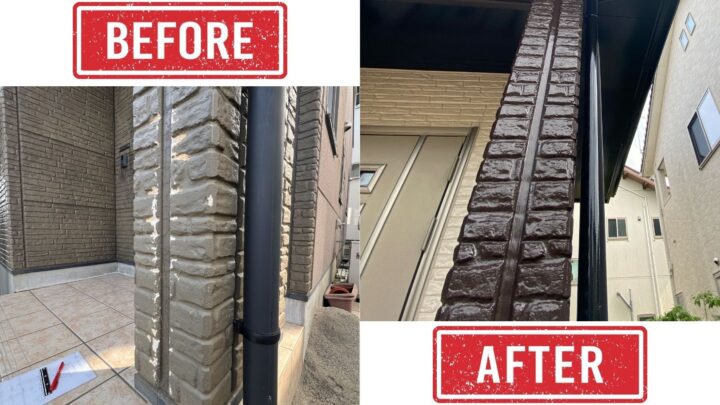 意匠性の高い外壁柱部分は、塗膜の劣化により白っぽく粉を吹いた状態や、素材感がぼやけてしまっている状況でした。下地処理を丁寧に行ったうえで、素材の凹凸を活かす塗装を施し、立体感と重厚感をしっかりと再現しています。AFTERでは、陰影がくっきりと出て、デザイン性が際立つ仕上がりとなりました。外壁全体のアクセントとして、建物の印象を引き締める重要なポイントになっています。