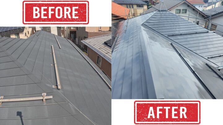屋根は紫外線や雨風の影響を最も受けやすく、BEFOREでは色あせや防水性能の低下が見られました。今回は屋根塗装も同時に行い、下地調整後に塗装を重ねることで、しっかりと保護性能を回復させています。AFTERでは、色ムラのない美しい仕上がりとなり、屋根全体が引き締まった印象になりました。住まいを長く守るうえで、非常に重要なメンテナンスとなっています。